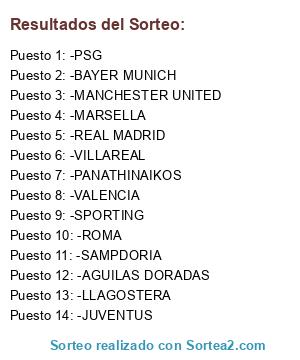 Lista de participantes: -SPORTING, -SAMPDORIA, -ROMA, -VILLAREAL, -MANCHESTER UNITED, -BAYER MUNICH, -REAL MADRID, -AGUILAS DORADAS, -PANATHINAIKOS, -LLAGOSTERA, -JUVENTUS, -MARSELLA, -PSG, -VALENCIA.