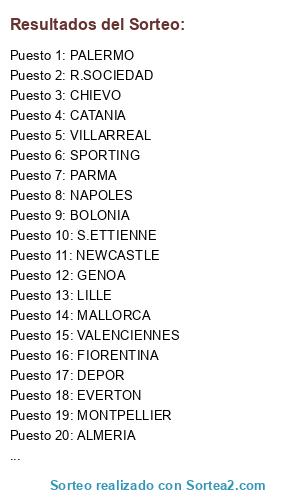 Lista de participantes: MALAGA, ZARAGOZA, ATH.BILBAO, GETAFE, OSASUNA, DEPOR, HERCULES, LEVANTE, MALLORCA, RACING, R.SOCIEDAD, ALMERIA, VILLARREAL, SPORTING, ESPAÑOL, NEWCASTLE, ASTON VILLA, BIRMIGHAM, BLACKBURNS, BOLTON, EVERTON, FULHAM, SUNDERLAND, WEST HAM, WIGAN, BOLONIA, FIORENTINA, PARMA, CATANIA, GENOA, LAZIO, NAPOLES, PALERMO, UDINENSE, BARI, CHIEVO, MONACO, GIRONDINS, LENS, LORIENT, MONTPELLIER, NANCY, PSG, RENNES, S.ETTIENNE, SOCHAUX, TOLOUSSE, VALENCIENNES, LILLE, AT.MADRID, M.CITY, JUVENTUS.