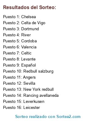 Lista de participantes: napoles, Barcelona, milan, Liverpool, Chelsea, zenit, inter, Madrid, santos, totenham, Sevilla, arsenal, lazio, borussia, psg, juventus, udinese, city, atlético Madrid, schalke, Bilbao, manchester, valencia, bayern munich.