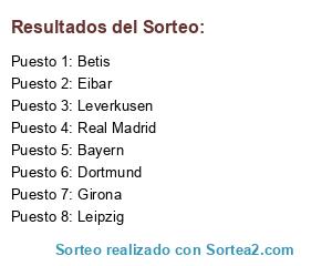 Lista de participantes: Real Madrid, Leverkusen, Eibar, Leipzig, Girona, Dortmund, Bayern, Betis.