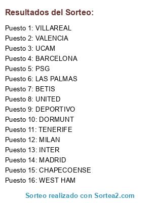 Lista de participantes: MADRID, UCAM, INTER, TENERIFE, PSG, VILLAREAL, UNITED, WEST HAM, BETIS, LAS PALMAS, BARCELONA, DORMUNT, VALENCIA, DEPORTIVO, CHAPECOENSE, MILAN.