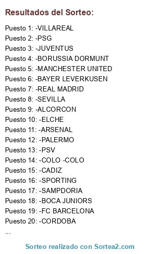 Lista de participantes: -SPORTING, -ELCHE, -ROMA, -ARSENAL, -VILLAREAL, -MANCHESTER UNITED, -CADIZ, -FC BARCELONA, -ALCORCON, -RCD ESPANYOL, -BOCA JUNIORS, -JUVENTUS, -MILAN, -RAYO VALLECANO, -SEVILLA, -CORDOBA, -AT.BILBAO, -BORUSSIA DORMUNT, -BAYER LEVERKUSEN, -PSV, -COLO -COLO, -PALERMO, -TORINO, -PSG, -SAMPDORIA, -MALAGA, -VALENCIA, -REAL MADRID.