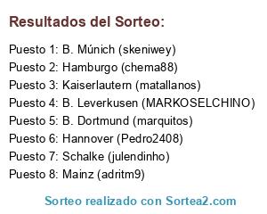 Lista de participantes: B. Leverkusen (MARKOSELCHINO), B. Múnich (skeniwey), B. Dortmund (marquitos), Hamburgo (chema88), Hannover (Pedro2408), Kaiserlautern (matallanos), Mainz (adritm9), Schalke (julendinho).