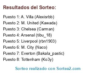 Lista de participantes: Arsenal (tibu_18), A. Villa (Alexisrbb), Chelsea (Carman), Everton (Bakala_pastic), Liverpool (rbn1903), M. United (Kawada), M. City (Naco), Tottenham (Ko3y).