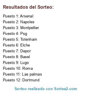 Lista de participantes: Depor, Lugo, Psg, Elche, Montpellier, Roma, Las palmas, Dortmund, Basel, Totenham, Napoles, Arsenal.