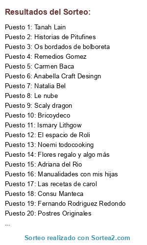 Lista de participantes: Patricia Blanco, El espacio de Roli, Maribel Toledo, Os bordados de bolboreta, Noemi todocooking, Karina mamá y nene, Scaly dragon, Postres Originales, Tanah Lain, Las recetas de carol, Historias de Pitufines, Laura Martín, Fernando Rodriguez Redondo, Mi querida cocinera, Sabrina Bcn, Taina, Elena Revelo, Carmen Baca, Ana Minaya García, Eli Hernández, Manualidades con mis hijas, Bricoydeco, Sandra el mundo de lila, Ismary Lithgow, Anabella Craft Desingn, Cuando Eli, Maria Perez Murcia, A que huele el scrap, Monstsar mis chicos y yo, Alicia Jimenez, Papelisimo, Le nube, Hecho x Bugui, Natalia Bel, Flores regalo y algo más, Eugenia Castaño, Sandra Pila Tejada, Consu Manteca, Adriana del Rio, Montse GP, Libelula Manualidades, Remedios Gomez, Tardes con alma, Noelia Tomás, Ely mamá de día y de noche, María Victoria Cediel Escobar.