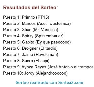 Lista de participantes: Primito (PT15), Jordy (Alejandroooooo), Marcos (Acetil ciesteinico), Gabito (Ey que pasooooo), Sacro (El capi), Spirky (Spirkembauer), Jaime (Revoluman), Droigner (El tardío), Xtian (Mr. Vaselina), Ayoze Reyes (José Antonio el tramposo).