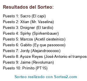Lista de participantes: Primito (PT15), Jordy (Alejandroooooo), Marcos (Acetil ciesteinico), Gabito (Ey que pasooooo), Sacro (El capi), Spirky (Spirkembauer), Jaime (Revoluman), Droigner (El tardío), Xtian (Mr. Vaselina), Ayoze Reyes (José Antonio el tramposo).