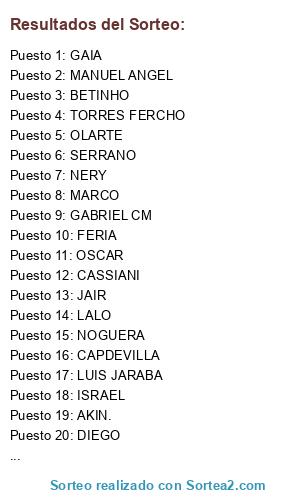 Lista de participantes: TEO, RAUL, JORGE, LUIS JARABA, MARCO, DIEGO, DAVID PELAEZ, TORRES FERCHO, SERRANO, KEVIN, GABRIEL CM, HUGO, CASSIANI, OLARTE, MONTOYA, NOGUERA, FERIA, JAIR, JHON, ISRAEL, MANUEL ANGEL, TORTUS, FRANCIS, OSCAR, GAIA, CESAR MARTINEZ, LALO, JOSEPH, PANIAGUA, NERY, ADRIANCHO, BETINHO, CAPDEVILLA, ARTHUR, AKIN..