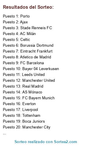 Lista de participantes: AC Milán, Ajax, AS Mónaco, Atletico de Madrid, Bayer 04 Leverkusen, Boca Juniors, Borussia Dortmund, Celtic, Eintracht Frankfurt, Everton, FC Barcelona, FC Bayern Munich, FSV Mainz 05, Juventus, Leeds United, Liverpool, Manchester City, Manchester United, Porto, PSG, Real Madrid, Stade Renneis FC, Tottenham.