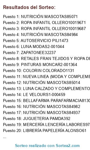 Lista de participantes: PINTURAS MONCAR1339, PINTURAS MONCAR2-001341, LUNA CALZADO Y COMPLEMENTOS4-000552, AUTOSERVICIO PILI1468, RETALES FRAN TEJIDOS Y ROPA DE HOGAR5430, LUNA MODAS2-001043, RETALES FRAN TEJIDOS Y ROPA DE HOGAR5432, COPIPLUS CORIA56243, RETALES FRAN TEJIDOS Y ROPA DE HOGAR5436, LUNA MODAS2-001044, BELLAFARMA PARAFARMACIAT19/7113, BELLAFARMA PARAFARMACIA7114, BELLAFARMA PARAFARMACIA8130, BELLAFARMA PARAFARMACIA8140, BELLAFARMA PARAFARMACIA8141, PINTURAS MONCAR2-001342, RETALES FRAN TEJIDOS Y ROPA DE HOGAR5441, BELLAFARMA PARAFARMACIA8142, ROPA INFANTIL OLLERO10019615, PINTURAS MONCAR2-001343, PINTURAS MONCAR2-001344, LA CASITA DE LARAT22/444, PINTURAS MONCAR2-001346, LIBRERÍA COPISTERÍA NAROGA202202645, LUNA MODAS2-001045, BELLAFARMA PARAFARMACIA8143, RETALES FRAN TEJIDOS Y ROPA DE HOGAR5447, ROPA INFANTIL OLLERO10019616, BELLAFARMA PARAFARMACIA8144, NUEVA LINEA (MODA Y COMPLEMENTOS)1000592, LIBRERÍA PAPELERÍA ALONSO14, LUNA MODAS2-001046, PINTURAS MONCAR2-001347, LIBRERÍA COPISTERÍA NAROGA202100319, COPIPLUS CORIA56248, PINTURAS MONCAR2-001349, LUNA MODAS2-001047, PINTURAS MONCAR2-001350, LUNA MODAS2-001048, NUEVA LINEA (MODA Y COMPLEMENTOS)1000593, LUNA CALZADO Y COMPLEMENTOS4-000553, LUNA CALZADO Y COMPLEMENTOS4-000554, LUNA MODAS2-001049, LIBRERÍA PAPELERÍA ALONSO12, BELLAFARMA PARAFARMACIA8145, FARMACIA MERCEDES PASCUAL ECHÁVARRID-007542, FARMACIA MERCEDES PASCUAL ECHÁVARRID-007522, NUEVA LINEA (MODA Y COMPLEMENTOS)1000558, EVA REYES MODA Y COMPLEMENTOS613, BELLAFARMA PARAFARMACIA8146, RETALES FRAN TEJIDOS Y ROPA DE HOGAR5434, BELLAFARMA PARAFARMACIA8147, RETALES FRAN TEJIDOS Y ROPA DE HOGAR5460, FARMACIA MERCEDES PASCUAL ECHÁVARRID-007551, LIBRERÍA COPISTERÍA NAROGA202100321, COPIPLUS CORIA56254, EVA REYES MODA Y COMPLEMENTOS612, BELLAFARMA PARAFARMACIA8148, NUEVA LINEA (MODA Y COMPLEMENTOS)1000595, COQUETOS2-001050, AUTOSERVICIO PILI1479, FARMACIA MERCEDES PASCUAL ECHÁVARRID-007554, EMÍLIA PERFUMERÍA133143, RETALES FRAN TEJIDOS Y ROPA DE HOGAR5469, RETALES FRAN TEJIDOS Y ROPA DE HOGAR5470, LIBRERÍA COPISTERÍA NAROGA202202647, PINTURAS MONCAR2-001353, PINTURAS MONCAR2-001354, COPIPLUS CORIA56258, FARMACIA MERCEDES PASCUAL ECHÁVARRID-007558, PELUQUERÍA BRAVO211, PELUQUERÍA BRAVO212, AGUJA DE OROTK00017150, MERCERÍA LENCERÍA LABORES97445, MERCERÍA LENCERÍA LABORES97444, MERCERÍA LENCERÍA LABORES97443, MERCERÍA LENCERÍA LABORES97442, MERCERÍA LENCERÍA LABORES97441, MERCERÍA LENCERÍA LABORES97440, MERCERÍA LENCERÍA LABORES97439, MERCERÍA LENCERÍA LABORES97438, MERCERÍA LENCERÍA LABORES97436, MERCERÍA LENCERÍA LABORES97435, MERCERÍA LENCERÍA LABORES97434, MERCERÍA LENCERÍA LABORES97433, MERCERÍA LENCERÍA LABORES97432, MERCERÍA LENCERÍA LABORES97431, MERCERÍA LENCERÍA LABORES97430, MERCERÍA LENCERÍA LABORES97429, MERCERÍA LENCERÍA LABORES97428, MERCERÍA LENCERÍA LABORES97427, MERCERÍA LENCERÍA LABORES97425, MERCERÍA LENCERÍA LABORES97424, MERCERÍA LENCERÍA LABORES97426, MERCERÍA LENCERÍA LABORES97437, TERESA MAYOT10/32239, PELUQUERÍA BRAVO213, COPIPLUS CORIA56264, BELLAFARMA PARAFARMACIA8150, EMÍLIA PERFUMERÍA133156, COQUETOS2-001051, BELLAFARMA PARAFARMACIA8151, NUEVA LINEA (MODA Y COMPLEMENTOS)1000596, LIBRERÍA COPISTERÍA NAROGA202202650, LUNA MODAS2-001052, LUNA CALZADO Y COMPLEMENTOS4-000555, LUNA CALZADO Y COMPLEMENTOS4-000556, NUEVA LINEA (MODA Y COMPLEMENTOS)1000000597, LIBRERÍA PAPELERÍA ALONSO16, LIBRERÍA COPISTERÍA NAROGA202100330, LIBRERÍA COPISTERÍA NAROGA202202652, NUEVA LINEA (MODA Y COMPLEMENTOS)1000598, LIBRERÍA COPISTERÍA NAROGA202202653, LIBRERÍA COPISTERÍA NAROGA202100331, AUTOSERVICIO PILI1475, COLORIN COLORADO1097, COPIPLUS CORIA56267, FARMACIA MERCEDES PASCUAL ECHÁVARRID-007570, NUTRICIÓN MASCOTAS84918, LA CASITA DE LARAT22/446, NUEVA LINEA (MODA Y COMPLEMENTOS)1000599, COPIPLUS CORIA56269, ROPA INFANTIL OLLERO10019617, LA CASITA DE LARAT22/419, IDEA OLIVERA CORIA546869, IDEA OLIVERA CORIAC/797, NUEVA LINEA (MODA Y COMPLEMENTOS)1000600, LIBRERÍA COPISTERÍA NAROGA202202656, PATRICIA MENDO803, NUEVA LINEA (MODA Y COMPLEMENTOS)1000601, LIBRERÍA COPISTERÍA NAROGA202202659, LUNA CALZADO Y COMPLEMENTOS4-000557, LIBRERÍA COPISTERÍA NAROGA202202660, FARMACIA MERCEDES PASCUAL ECHÁVARRID-007573, IDEA OLIVERA CORIAC798, PELUQUERÍA BRAVO214, LIBRERÍA DOMÍNGUEZ10027143, LIBRERÍA DOMÍNGUEZ10027144, ZAPATONEE32099, ROPA INFANTIL OLLERO10019618, ZAPATONEE032094/T-03, FARMACIA MERCEDES PASCUAL ECHÁVARRID-007577, LIBRERÍA PAPELERÍA ALONSO17, FARMACIA MERCEDES PASCUAL ECHÁVARRID-007580, LIBRERÍA COPISTERÍA NAROGA202202662, NUEVA LINEA (MODA Y COMPLEMENTOS)1000602, LUNA MODAS2-001054, EVA REYES MODA Y COMPLEMENTOS619, LIBRERÍA COPISTERÍA NAROGA202100332, FARMACIA MERCEDES PASCUAL ECHÁVARRID-007586, LIBRERÍA COPISTERÍA NAROGA202202663, LUNA CALZADO Y COMPLEMENTOS4-000558, LUNA MODAS2-001055, ZAPATERÍA INFANTIL ABRACADABRA1426, COQUETOS2-001054, EVA REYES MODA Y COMPLEMENTOS621, RETALES FRAN TEJIDOS Y ROPA DE HOGAR5499, JUGUETERIA PAMDA386, FARMACIA MERCEDES PASCUAL ECHÁVARRID-007568, LIBRERÍA PAPELERÍA ALONSO19, AYAKKABI772, NUEVA LINEA (MODA Y COMPLEMENTOS)1000603, IDEA OLIVERA CORIA799/C, COQUETOS1052, EVA REYES MODA Y COMPLEMENTOSY/620, EVA REYES MODA Y COMPLEMENTOST/620, ZAPATERÍA INFANTIL ABRACADABRA1427, NATUR HOUSE371, A&D ALONSO22627, AUTOSERVICIO PILI1487, EL TALLER DE ANA3146, NUTRICIÓN MASCOTAS84919, CHURRERÍA SAMA9357, NUTRICIÓN MASCOTASTK/84920, CICLOS ORCHANDOb22/431, CICLOS ORCHANDOb22/432, CICLOS ORCHANDOb22/433, CICLOS ORCHANDOb22/434, CICLOS ORCHANDOb22/435, CICLOS ORCHANDOb22/436, CICLOS ORCHANDOb22/437, CICLOS ORCHANDOb22/438, FARMACIA MERCEDES PASCUAL ECHÁVARRID-007587, FARMACIA MERCEDES PASCUAL ECHÁVARRID007589, RETALES FRAN TEJIDOS Y ROPA DE HOGAR5512, LIBRERÍA COPISTERÍA NAROGA202202664, BELLAFARMA PARAFARMACIA8152, PINTURAS MONCAR2-001364, LIBRERÍA PAPELERÍA ALONSO23, COLORIN COLORADO1102, LUNA MODAS2-001056, NUEVA LINEA (MODA Y
