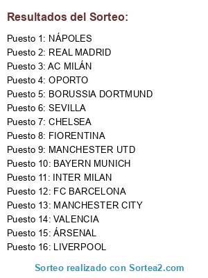 Lista de participantes: FC BARCELONA, REAL MADRID, ÁRSENAL, CHELSEA, MANCHESTER UTD, NÁPOLES, MANCHESTER CITY, VALENCIA, BAYERN MUNICH, FIORENTINA, BORUSSIA DORTMUND, INTER MILAN, AC MILÁN, SEVILLA, LIVERPOOL, OPORTO.