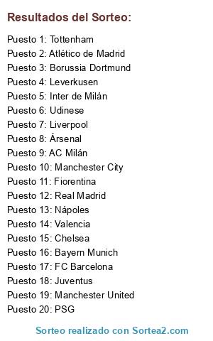Lista de participantes: Manchester City, Real Madrid, Nápoles, Inter de Milán, Manchester United, Ársenal, Chelsea, Valencia, FC Barcelona, Bayern Munich, Juventus, Liverpool, Atlético de Madrid, AC Milán, PSG, Borussia Dortmund, Tottenham, Leverkusen, Fiorentina, Udinese.