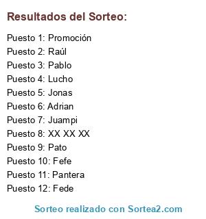 Lista de participantes: Raúl, Juampi, Pablo, Fede, Fefe, Lucho, Jonas, Adrian, Pato, Pantera, Promoción, XX XX XX.