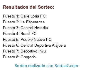Lista de participantes: Calle Loria FC, Deportivo Invu, Central Heredia, Central Deportiva Alajuela, Gregorio, Pueblo Nuevo FC, La Esperanza, Brasil FC.