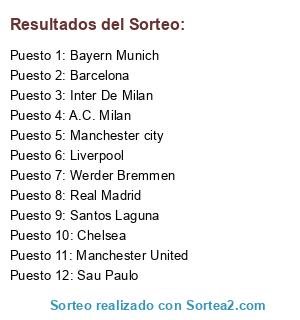 Lista de participantes: Sau Paulo, Barcelona, A.C. Milan, Werder Bremmen, Inter De Milan, Santos Laguna, Real Madrid, Chelsea, Manchester city, Liverpool, Bayern Munich, Manchester United.