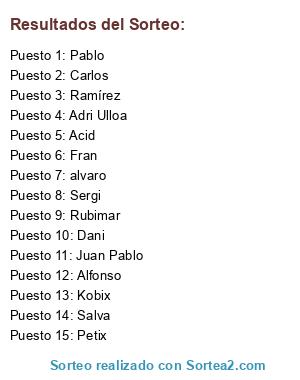 Lista de participantes: Acid, Carlos, Salva, Alfonso, alvaro, Dani, Sergi, Kobix, Fran, Adri Ulloa, Petix, Pablo, Ramírez, Juan Pablo, Rubimar.