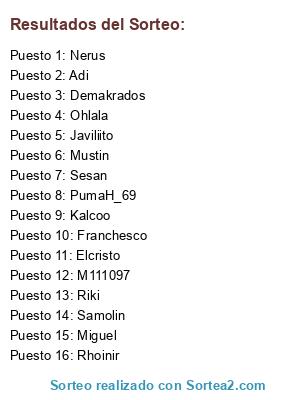 Lista de participantes: Mustin, Sesan, Elcristo, Adi, Javiliito, Riki, Miguel, Rhoinir, Franchesco, Samolin, M111097, Demakrados, Ohlala, Kalcoo, Nerus, PumaH_69.