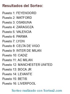 Lista de participantes: CADIZ, VALENCIA, AC MILAN, FEYENOORD, BOCA JR, MANCHESTER UNITED, CELTA DE VIGO, PARMA, ZARAGOZA, INTER DE MILAN, BETIS, LYON, LIVERPOOL, WATFORD, LEVANTE, OSASUNA.