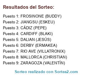 Lista de participantes: FROSINONE (BUDDY), CÁDIZ (PEPE), CARDIFF (BLAKI), DALIAN (JESÚS), DERBY (ERMAKEA), MALLORCA (CHRISTIAN), RIO AVE (VILLATRONIX), JIANGSU (ESKEU), ZARAGOZA (VALENTÍN).