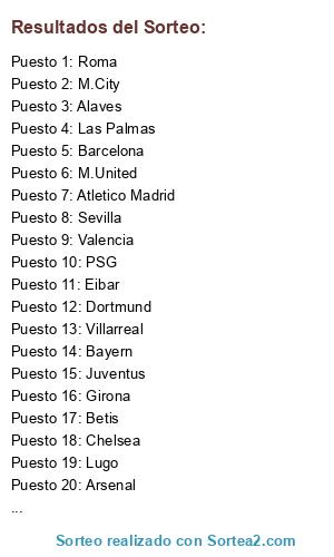 Lista de participantes: Panathinaikos, United, Betis, Arsenal, Valencia, Sevilla, Sporting, Las palmas, City, Sunderland, Cadiz, Barsa, Olympiakos, Watford, Aston Villa, Fulham.