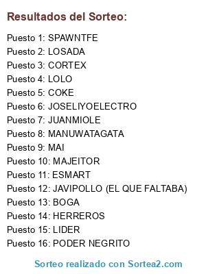 Lista de participantes: BOGA, LIDER, JOSELIYOELECTRO, ESMART, HERREROS, JUANMIOLE, LOLO, COKE, CORTEX, PODER NEGRITO, MAJEITOR, MAI, MANUWATAGATA, SPAWNTFE, JAVIPOLLO (EL QUE FALTABA), LOSADA.