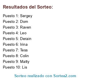 Lista de participantes: Irina, Raven, Sergey, Leo, Matty, Colin, Tess, Lis, Dom, Derain.