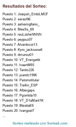 Lista de participantes: VT_Energetik, peppuz07, Traifor_ESP, Blesita69, YeraiGuiu2311, rauLzsheNNNN, sersol96, Tanito226, Kyro_jackrussell, Joaquin_EmbiLMCF, BlesSs_69, Alvaritocor13, kuyd10, Albergaps, Pgombla10, Ivangoal7, aalvarogllano_, Pedrovelasco95, Ghost_Z1sr4C, Palomotitular, dmunoz01, juandc1996, VT_D1aMant1K, IvaanM95.