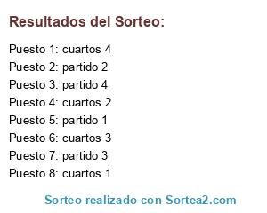 Lista de participantes: partido 1, partido 2, partido 3, partido 4, cuartos 1, cuartos 2, cuartos 3, cuartos 4.