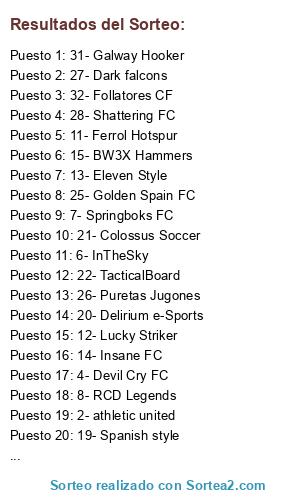 Lista de participantes: 1- La Hermandad, 2- athletic united, 3- Arise Fc, 4- Devil Cry FC, 5- Pitufumones, 6- InTheSky, 7- Springboks FC, 8- RCD Legends, 9- revival tf, 10- galaxy shadow, 11- Ferrol Hotspur, 12- Lucky Striker, 13- Eleven Style, 14- Insane FC, 15- BW3X Hammers, 16- Lethal Army, 17- The lions crew, 18- Gentlmen SAD, 19- Spanish style, 20- Delirium e-Sports, 21- Colossus Soccer, 22- TacticalBoard, 23- Raptors United, 24- Imperium FC, 25- Golden Spain FC, 26- Puretas Jugones, 27- Dark falcons, 28- Shattering FC, 29- Eleven Wizards, 30- ChiringuitoBull, 31- Galway Hooker, 32- Follatores CF.