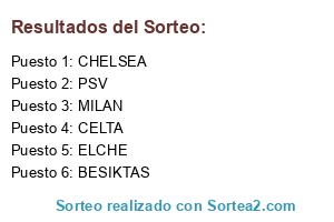 Lista de participantes: CELTA, PSV, MILAN, ELCHE, BESIKTAS, CHELSEA.