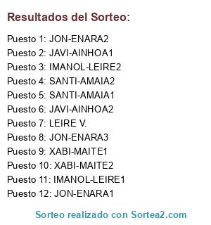 Lista de participantes: JON-ENARA1, JON-ENARA2, JON-ENARA3, JAVI-AINHOA1, JAVI-AINHOA2, SANTI-AMAIA1, SANTI-AMAIA2, IMANOL-LEIRE1, IMANOL-LEIRE2, XABI-MAITE1, XABI-MAITE2, LEIRE V..