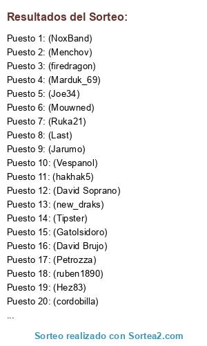 Lista de participantes: (Ruka21), (Mouwned), (toni_v13), (Tipster), (firedragon), (ruben1890), (NoxBand), (GatoIsidoro), (buesa), (O'Driscoll), (Vespanol), (David Soprano), (hakhak5), (Menchov), (Last), (zAiA), (Joe34), (cordobilla), (Marduk_69), (Hez83), (Jarumo), (David Brujo), (new_draks), (Petrozza).