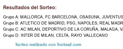 Lista de participantes: CELTA, NAPOLES, RAYO VALLECANO, REAL MADRID, MALLORCA, INTER DE MILAN, MALAGA, AC MILAN, ATLETICO DE MADRID, PSG, OSASUNA, FC BARCELONA, JUVENTUS, VALENCIA, DEPORTIVO DE LA CORUÑA.