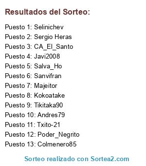 Lista de participantes: Poder_Negrito, Salva_Ho, Txito-21, Selinichev, Majeitor, Tikitaka90, CA_El_Santo, Kokoatake, Sanvifran, Javi2008, Andres79, Colmenero85, Sergio Heras.