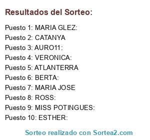 Lista de participantes: BRANCA DE NEVE, LAURA (LUJOLOWCOST), BETTIE, BLOODYROSE, NPOE:, FLO:, PAXINDIA:, MISS POTINGUES:, OLGA Cosmetica:, WEN:, LUZ:, ESTHER:, LUCYBOOP, ANDREA (ASTURIAS), MIRIAM GAZQUEZ, CRIS SEVILLA:, MARIA GLEZ:, CLAUDIA:, MONTSE:, MAPACHITO:, ROSS:, CLIO 33:, POLLO2PITU:, VIRGINIA:, MARIA (MROSAGRA):, MISS THIRTY:, SONIA:, SONIX:, MLDLR:, FISIWOMAN:, ZAIDA:, KATYA NOIA, WELZEN, VERONICA:, ANDREA (LAVIDAENROSA), PATRY:, PERLICA84:, ROSALIA:, ESTELBLAU:, BERTA:, LA REINA COTILLA:, AG180, EMMA BV, FACTORIA DE COLORES:, RUTH (ATENERY), ASUN M, AURO11:, DREMELENA (ROSETTA), ITZI:, CHELO:, SIROCOX:, VERONICA (VERO69), MARC:, IVICH ACTIVA:, ELENA1977:, ANA BELEN:, AINARA, ISA, MAYTE, EVA, ATLANTERRA, LOLA.MINE, MARIA JOSE, MARISA, CATANYA, ANDREA (ANDIGALORT), VENTOLINOS, MARIA VICENTE.