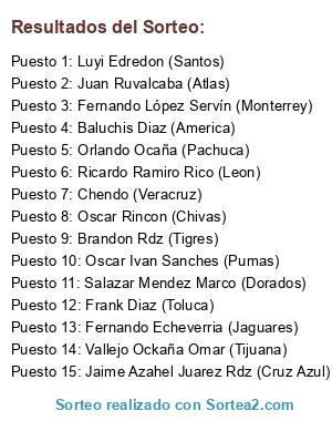 Lista de participantes: Juan Ruvalcaba (Atlas), Fernando López Servín (Monterrey), Jaime Azahel Juarez Rdz (Cruz Azul), Baluchis Diaz (America), Brandon Rdz (Tigres), Oscar Ivan Sanches (Pumas), Oscar Rincon (Chivas), Orlando Ocaña (Pachuca), Ricardo Ramiro Rico (Leon), Luyi Edredon (Santos), Frank Diaz (Toluca), Vallejo Ockaña Omar (Tijuana), Salazar Mendez Marco (Dorados), Fernando Echeverria (Jaguares), Chendo (Veracruz).