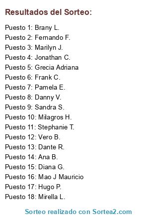 Lista de participantes: Danny V., Sandra S., Fernando F., Dante R., Milagros H., Frank C., Brany L., Diana G., Hugo P., Mao J Mauricio, Marilyn J., Mirella L., Pamela E., Stephanie T., Ana B., Vero B., Grecia Adriana, Jonathan C., .