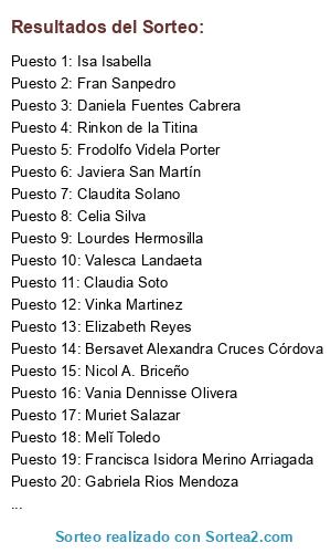 Lista de participantes: Adriana Garcia, Alejandra Díaz Vera, Alexis Fonseca Suazo(18 participaciones), Alicia Zapata, Alison Riquelme(3 participaciones), Allison Maitland, Amanda Retamal Friz, Ana María Santander, Andrea Jofre Morales, Andrea Patricia Garcia Donoso, Ange Bustamante Navarro, Ángela Salinas Alvial, ArtificeStore Tienda Chile, Asly Valentina Morales Cuevas, Bazar Imagine Conce(4 participaciones), Belen Patiluna, Berni Cuadra Frindt, Bersavet Alexandra Cruces Córdova, Bianca Rodríguez, Caammy Fernanda, Camila Arellano Bütikofer, Camila Belen Figueroa Neira, Camila Maldonado(2 participaciones), Carla Muñoz, Carlita Salazar Castro, Carola Calderón, Carolina Acevedo, Carolina Cabrera Cancino(2 participaciones), Carolina Inés Bravo Saavedra, Carolina Zuusy Oñate, Cata Jesús Correa M(2 participaciones), Catalina Alejandra Durán, Cecilia Muñoz Ramírez, Cecilia Zapata(9 participaciones), Celia Silva(8 participaciones), Cintia Solange Suazo Yañez, Clau San Martín, Claudia Andrea Cruz Ramos(2 participaciones), Claudia C. Arenas, Claudia Soto(2 participaciones), Claudita Solano, Coni Belmar(2 participaciones), ConnyGabriela Cuevas Mellado, Cristina Zapata Rojas(2 participaciones), Cyndi Aileen Gallegos Gallegos, Daerly Astudillo Santos, Dani Alejandra, Dani Fernandez, Dani Ortega, Daniela Alejandra Amaro, Daniela Constanza(6 participaciones), Daniela Fernanda Bastias Navarro, Daniela Fuentes Cabrera(10 participaciones), Daniela Scarlet, Daniela Valentina, Danii Alarcon, Drrthu Barrientos(2 participaciones), Elizabeth Reyes(17 participaciones), Eric Rodriguez Buglioni, Ernesto Ortega Saez(7 participaciones), Eva Mellado González, Evelyn Raquel(3 participaciones), Fabiola Torres, Fanny Agüero Cabrera, Felipe Higueras Villegas(3 participaciones), Feñau Rocha, Fer Arriagada, Fernanda Jorquera Contreras, Fran Sanpedro(40 participaciones), Francisca Elizabeth Valenzuela, Francisca Isidora Merino Arriagada, Francisca Medina, Frodolfo Videla Porter, Gabriela Rios Mendoza, Giselle A Cartes E, Giselle Arleth Cartes(3 participaciones), Gloria Castillo Poblete, Isa Isabella(6 participaciones), Isabella Ferrari c, Javiera San Martín, Jazmin Aravena, Jenni Esparza, Jenny Soledad Vásquez Estrada(3 participaciones), Jocelyn Andrea Jara Toledo(2 participaciones), K-aammy Valdebenito, Karen Vera Mendoza, Karin Romina Urzúa Acosta, Karina Ganga, Katherine Céspedes Céspedes(2 participaciones), Katherine Concha Valdebenito(2 participaciones), Kattherinne Pardo, Laura Pilar Cifuentes Burgos, Leslie Lita Herrera, Leslie Marisol Encina Tapia, Lien Ale Cabrera Cartes, Lorena Farias Valenzuela, Lourdes Hermosilla(6 participaciones), Luisa RM, Maite Giannina Godoy Carvajal, Marcela Gallardo Fierro, Marcela Lily Mora Gallardo, Marcela Solis Bustos, Mari Mari Mari Mari(7 participaciones), Maria Jose San Martin Orue, MariaFernanda Contreras Jara, Mariela Nathalie Carrasco Carrasco, Maybeline Belmar Quezada, Melĭ Toledo, Mercedes Skrabonja de Cano, Meyling Ko, Micol Silva, Minerva Angelica Manosalva Gutierrez, Miriam Ordenes, Muriet Salazar, Nadia Liddell(2 participaciones), Natalia Saldias Quiero, Natalie Pérez(2 participaciones), Nathalie Melissa, Nathaly Martinez Peña, Nicol A. Briceño(2 participaciones), Olga Valentina Contreras Rosales, Pamela Delgado Ortega, Pamela Reyes Arevalo, Paola Cabezas Matus, Patricia Ninaret Bravo Sepúlveda, Paulina Javiera Soto Sepúlveda, Rinkon de la Titina(50 participaciones), Romina Estefania(6 participaciones), Rou M. Jordan, Silvana Leal Aguilera, Sol Marcela Jara Villaseñor, Soledad Macarena Troncoso Arros, Stephanie Eileen Sazo Thieme, Tammy Sabando, Todo de Ventas, Torta De Paños Concepcion, Valentina Ignacia Mardones Rodriguez, Valentina Peña, Valesca Landaeta(2 participaciones), Valeska Sanhueza, Valeska Ureta Quijada, Vanesa Constanza Ramirez Parra, Vanessa Andrea Ramirez Urrea, Vanessa Letelier Valverde, Vania Dennisse Olivera(2 participaciones), Vania Franulic Plaza, Viarly Fabiola Rivas Fuentes, Vinka Martinez(3 participaciones), Xenia Anaís, Yasna Sepúlveda Garrido, Yessenia Cruz Jeldres, Yessica Parada.