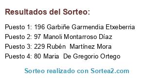 Lista de participantes: 1 Alicia Pons Favieres, 2 Magin Peréz Rodríguez, 3 Oksana Mandryk, 4 José Juan López González, 5 Mª Jose Tornes Salleiro, 6 Sonia Carballo Pastoriza, 7 Sonia Minguez Matias, 8 Aurora Anton Escudero, 9 Estela Arrellano Sancho, 10 Mº Angeles Zoca Lara, 11 Felix Ruiz Blanco, 12 Concepción Lago Alba, 13 Mónica Gonzalez Fontaneda, 14 Jesus Felix Espinosa Martinez, 15 Luis Javier Abanzas, 16 Beatriz Bravo Fernández, 17 Juan Carlos Coder Soenz, 18 Irea Bou Martín, 19 Iván de Pablo Carril Aldrey, 20 Ana Maria Montes Fernandez, 21 Blanca Solis del Diego, 22 Aurora Goás Castro, 23 Mª Dolores Pastoriza Díaz, 24 Dominica Marinez Castillo, 25 Ana Mª Viana Baños, 26 Ángel Dos Anjos Sedón, 27 Mª Gracia Mora Reina, 28 Josefa Garcia Ruiz, 29 Lorenzo Javier Barroso Doñas, 30 José Manuel Castanedo Martinez, 31 Carlos Río Echevarría, 32 José Manuel Novegil Gil, 33 Jonathan Arjona Pancho, 34 Natalia Clara Almendra, 35 Maria Del Prado Ortiz Tovar, 36 Esther Maskariano, 37 Raquel Campos Carames, 38 Mª Mercedes Curidadanes Vicente, 39 Mª Carmen Espada Fernández, 40 Pilar Cabre Rubio, 41 Miguel Valero Navalón, 42 Lidia González-Linares Campuzano, 43 Rosa Vian García, 44 Mª Pilar Lorén Aisa, 45 Carlos Uranga Castro, 46 Ana Belén Lago Vazquez, 47 Mª Esperanza Alvarez Gonzalez, 48 Carmen Vilchez Badorrey, 49 Diego Mendez Lopez, 50 Miriam Alvarez Vazquez, 51 Maria García Campos, 52 Cristina Marcos Perez, 53 Pura Otero Balado, 54 Rosa Maria Acelga Quintana, 55 Pilar Valero Gimenez, 56 Teresa Briones Diaz, 57 Diego Aguado Velasco, 58 Mikel Mateos Rubio, 59 Marta Madrid Juanes, 60 Carolina Buceta Resurrección, 61 Carmen Sotil Ros, 62 Olaia Cortijo Miguel, 63 Concepción Barbosa Gonzalez, 64 Angel Blade Costa, 65 Vanesa Pérez Gaisan, 66 Maria Jose Crespo Vaquero, 67 Rosa Ana Martínez Álvarez, 68 Elena Madariaga Billelabeitia, 69 Juana Alcalde, 70 Teodoro Montes Manzanares, 71 Eva Puelles Mesas, 72 Ion Zamakola Lizaedui, 73 Ignacio Muñoz Santos, 74 Luis Alberto Lago Vazquez, 75 Sergio Sanchéz Gomariz, 76 Javier Martinez Almau, 77 Basilio Echeguren Navaridas, 78 Maria De la Cruz Fuentes, 79 Miguel Veguer Tendero, 80 Maria De Gregorio Ortego, 81 Gloria Ruiz del Rio, 82 Elías López González, 83 Itziar Gutierrez Tamargo, 84 David Martinez Pavon, 85 Miguel Angel Martinez Mora, 86 Josefa Moreno García - Valenciano, 87 Leticia De laOsa Fernández, 88 Josefa Romero Trillo, 89 Ruth Fabra Yuguero, 90 Agustín Rodriguez Pazos, 91 Eva Mª Lopez- Castro Aragón, 92 Carmen Fernández Guindel, 93 Noemí Rua Cohello, 94 Sonia García Garret, 95 Mª Teresa Zurdo Gonzalez, 96 Ruben Paredes Outumuro, 97 Manoli Montarroso Díaz, 98 Eduardo Dacosta Prieto, 99 Nerea Torras Elizburu, 100 Anabel Ocon Ruiz, 101 Sonia Rodriguez García, 102 Deitze Moran, 103 Mª Begoña Rodriguez Pazos, 104 Daniel Ramirez Prado, 105 Olga Mª Chana Oquillas, 106 Marietel Fernández Fernández, 107 Daniel Iglesias Prieto, 108 Raquel González Blanco, 109 Juan Carlos Barreiro Amor, 110 Sara Gonzalez, 111 Iván Jorge Martinez, 112 Maria Begoña Martinez Cocó, 113 Maite Palenzuela Sancho, 114 Verónica González García, 115 Antonio Vazquez Romero, 116 Mónica Mariño Fernández, 117 Ana Isabel Ródriguez González, 118 Susana González Fernández, 119 Olivia Muro Merino, 120 Maria Casanovas Montes, 121 Carlos Gustavo Parrilla Ibañez, 122 Alfredo Reina Moreno, 123 Miriam Lozano Ramos, 124 Silvia Pardo Villa, 125 María José Castanedo Martinez, 126 Mª Angeles Castanedo Martinez, 127 Juan José Arnaiz Quintano, 128 Raquel Casilda García Ibisate, 129 Oskar Borrogon Asturias, 130 Esther Cerezo Gonzalez, 131 Mª del Pilar Gil Lopéz, 132 Marta Diaz Martinez, 133 Salvador Pla Chuliá, 134 Ana Belén Rodrigo Rodriguez, 135 Raquel De Miguel Catoira, 136 María Díaz, 137 Germán Muñoz Hernandez, 138 Enrique García Ramos, 139 Estibaliz Zendoia Solabarrieta, 140 David Hernandez Sanchez, 141 Virtudes Valdés Estevan, 142 Mª Lorena Bejaramo Ramos, 143 Jose Iñigo Otola Bagueneta, 144 Miguel Angel Rodrigo Bustillo, 145 Mercedes González González, 146 Mar Castellano, 147 Ana Goya Barrueta Beraza, 148 Patricia Gil Pascual, 149 Miguel Angel Salas Casquete, 150 Belén Maestro Martínez, 151 Ana Antoín Diez, 152 Eugenia Martín Salán, 153 Felipe Guerra Martinez, 154 Jorge Torices Camino, 155 Raquel Castro Robles, 156 Bernardo Calatayud Iborra, 157 Amparo Calatayud Murillo, 158 Patricia Marín Novoa, 159 Elisabeth Franco, 160 Kristina Wallace García, 161 Maria Jose De las Casas Herrerices, 162 Rocio Salamanca Martinez, 163 Alberto Irastorza Alvarez, 164 Jose Luis Rodal Seijo, 165 Concha Martínez Piñero, 166 Miguel Angel Regugiras Velasco, 167 Bruno Martín Samsegundo, 168 Manuel Luis Somoza Hermo, 169 Carlos Manuel Carbajo Fernandéz, 170 Joana Isabela Fraga De Llanos, 171 Miriam Velarde Dieguez, 172 Daida Betfencout Garcia, 173 Carmen Carames Garcia, 174 Beatriz Valero Villar, 175 Ana Mª Figueras Guil, 176 Javier Martín Alonso, 177 Eduardo Arevalo Saez, 178 Maria Del Carmen Hernadez Mendez, 179 Jose Gabriel Melero Gomez, 180 Agustín Gonzalez Mendique, 181 Maria Jesús De la Iglesia Turaño, 182 Mª Cruz Castell Garcia, 183 Jose Francisco Morlesin Collado, 184 Saray Espinosa Cirbián, 185 Laura Alonso Talegón, 186 Maria Del Carmen Hermo Álvarez, 187 Oscar Gomez Pimentel, 188 Jesús Igancio Sanchéz García, 189 Ana Maria Gonzalez Arroyo, 190 Begoña Ganuza Martín, 191 Askoa Ismene Fuenturbe Nuñez, 192 Silvestra De Llanos Mendoza, 193 Jose Antonio Ródriguez Pérez, 194 Edmundo Gil Maria, 195 Sonia Martín Sánchez, 196 Garbiñe Garmendia Etxeberria, 197 Rafael Mata Galgo, 198 Desire Aixut Turmo, 199 Oscar Lopez Alonso, 200 Ramón Diaz Acosta, 201 Rocia Perez García, 202 Luis Archilla Perez, 203 Vanesa Cuevas Sanz, 204 Mª del Carmen Vallarce Lorenzo, 205 Miguel Angel Morlesin Collado, 206 Sonia Cadenas Peres, 207 Lucía Nieves Gallego, 208 Cesar Díaz Sánchez, 209 Sonia Tomás Perez, 210 Jose C
