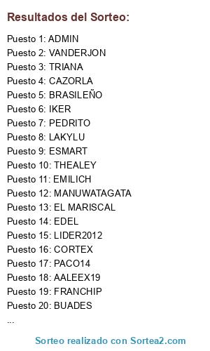 Lista de participantes: BANANAS, LAKYLU, PICHOTO, CAZORLA, CORTEX, THEALEY, IKER, FRANCHIP, PEDRO22, BRASILEÑO, PACO14, ADMIN, VANDERJON, ESMART, LIDER2012, MANUWATAGATA, EL MARISCAL, BUADES, AALEEX19, TRIANA, GOLFO, EDEL, EMILICH, PEDRITO.