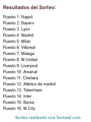 Lista de participantes: Lyon, Madrid, Napoli, Barsa, Chelsea, Malaga, Milan, M.United, M.City, Inter, Bayern, Arsenal, Atletico de madrid, Villareal, Liverpool, Totemham.