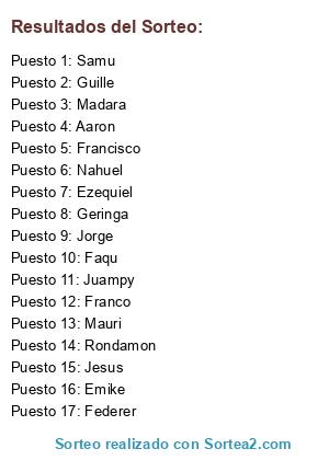 Lista de participantes: Emike, Jorge, Ezequiel, Aaron, Franco, Francisco, Juampy, Madara, Rondamon, Faqu, Samu, Mauri, Geringa, Nahuel, Federer, Jesus, Guille.