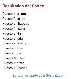 Lista de participantes: thaedus(7 participaciones), di9(7 participaciones), huargo(7 participaciones), dani(2 participaciones), sicmu, lluis(7 participaciones), juan(3 participaciones), rafa(3 participaciones), fran(3 participaciones), micro(2 participaciones), atunz(7 participaciones), rodru.