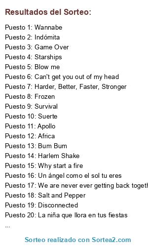 Lista de participantes: Why start a fire, Harlem Shake, Gangnam Style, Suerte, Boys, Survival, Un ángel como el sol tu eres, Right in, Bum Bum, Africa, Can't get you out of my head, We are never ever getting back together, Apollo, Game Over, What you know, Indómita, Starships, Live your dreams, You make me feel, Cuore Scoppiato, Salt and Pepper, Frozen, Harder, Better, Faster, Stronger, Disconnected, Lo mejor está por llegar, Blow me, Wannabe, Last Friday Night, La niña que llora en tus fiestas, 1 life, Tu te reconnaîtras, Ella Elle L'a.