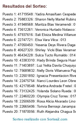 Lista de participantes: 45464038 Cecilia Pimentel Escobal 001, 22400591 Hortencia Zevallos Garcia 001, 80490015 Jacqueline Juliana Bartra Alvarado 001, 46457945 Mariela Arriaga Vasquez 001, 41930020 Milly Edy Chaupis Cervantes 001, 22475754 Nanci Lourdes Leon Obregon 001, 70930018 Brigitte Marcela Berrospi Almerco 002, 47268584 Ketty Janet Trujillo Bravo 002, 42178548 Martina Andrade Fretel 002, 44668278 Noemi Magdalena Isarra Martel 002, 45874513 Yaneth Cajas Obregon 002, 76456299 Luz Mary Mejia Llamoctanta 003, 76432226 Abigaid Deisy Crespo Palermo 005, 44235197 Katty Olivia Huaman Esteban 005, 75689832 Nelly Doris Villanueva Pajares 005, 46927407 Polet Yandira Zarate Arteaga 005, 76034042 Yesmira Susana Navarro Jara 005, 73132425 Yolanda Solano Rueda 005, 42838620 Yudith Consuelo Gomez Colonia 005, 22511188 Delia Cristina Munguia Agui 006, 47290873 Diana Diego Huacachino 006, 22512280 Gilda July Espejo Robles 006, 22460722 Jeny Lozan Tanjun 006, 48352393 Karen Yeraldine Fuentes Garcia 006, 71565204 Luzmila Santiago Cesppedes 006, 22674497 Macario Alfredo Tucto Santiago 006, 22674216 Rosa Luz Avila Lopez 006, 72761935 Ruth Paola Blua Moreno 006, 74430302 Yaki Lorena Padilla Casimiro 006, 45937346 Yessyca Carolina Huatuco Martel 006, 48489706 Claudia Betzabe Tolentino Santiago 007, 41633608 Edith Laura Ayzanoa Vizcarra 007, 74659950 Sandy Vanessa Malpartida Doria 007, 22477254 Angelica Maria Tolentino Leon 008, 40173966 Cristina Dina Justo Lastra 008, 71759480 Lucero Yosselin Aguirre Roque 008, 22418041 Maria Isabel Estela Ylivia 008, 22998018 Nazaria Rivera Lino 008, 22476488 Noimi Ruth Fonseca Livias 008, 22506509 Rosa Alicia Alvarado Lino 008, 47937616 Sali Eloiza Medina Villanueva De Jara 008, 75883326 Sharon Nelly Martel Rubina 008, 40017856 Silvana Dalina Camacho Alvarado 008, 22413227 Sonia Ponce Ramirez 008, 70322200 Tatiana Paola Rojas Orna 008, 41719548 Yadira Amasifuen Cespedes 008, 75900521 Sheyla Joseline Camara Cipriano 009, 44557814 Bertha Leonor Berrospi Quintana 010, 71398650 Gaby Delina Janampa Rufino 010, 73612261 Veronica Hurtado Nolasco 010, 76165668 Yhesli Mayli Lucas Andrade 010, 43617599 Andrea Grados Lopez 011, 22489719 Angelica Maria Takano Castaneda 011, 44902225 Cacilia Yannet Saldivar Galvez 011, 42715657 Carina Santos Martin 011, 73179373 Elizabeth Jael Serafico Cervantes 011, 04006280 Gelida Magda Prado Chavez 011, 22474224 Gladis Otilia Solorzano Armas 011, 22893937 Jovita Gallo Catalan 011, 22477567 Lucia Del Rosario Mory Vara 011, 10507811 Maria Angel Miraval Lijarza 011, 22506267 Maria Isabel Espinoza Rojas 011, 22508389 Maruja Mendieta Huaytan 011, 22747721 Elsa Vara Vilca 013, 22501892 Ignacia Presentacion Rivera 013, 72720186 Jimena Thalia Santillan Ramos 013, 61398225 Karen Lopez Yabar 013, 70679969 Karla Nalvarte Salazar 013, 74051672 Lys Lucia Salazar Reyes 013, 46620531 Maria Elena Pinedo Sifuentes 013, 41948568 Maritza Blas Veramendi 013, 22517556 Marli Bocanegra Del Castillo 013, 73367108 Rosseli Patricia Hermosilla Matos 013, 40627320 Shirley Vicki Blas Veramendi 013, 22889595 Sofia Vitalia Aquilino Huanca 013, 22499393 Celia Cruz Aguirre 014, 42100983 Delia Dalila Vargas Rimac 014, 44164901 Gloria Celia Pantoja Ramirez 014, 43383310 Hady Brinda Segura Huamalias 014, 74083346 Jazmin Kimberly Romero Cori 014, 80089687 Josue Canchari De La Cruz 014, 47494257 Katherin Yelitza Romero Malpartida 014, 75821602 Lizberh Anyolina Romero Malpartida 014, 41060776 Lucia Arratea Garcia 014, 71403897 Luz Yelita Davila Chuquiyauri 014, 40662993 Maria Teresa Rojas Reategui 014, 71384136 Michell Flormila Cruz Martinez 014, 22506266 Obdolia Jara Espinoza 014, 22416133 Sandra Aguirre Elias 014, 46434228 Sulca Tucto Rumaldo 014, 22495577 Yeni Geronimo Albornoz 014, 42450140 Angela Mazziel Palma Martel 017, 72424778 Kriss Alessandra Matos Aseijas 017, 48479249 Lucinda Norena Esteban 017, 22460220 Olympia Cruz Torres 017, 61629410 Sonia Luz Tolentino Estela 017, 04341869 Zhenia Mercedes Principe Berrospi 017, 47050450 Yesenia Deys Rivera Daga 018, 40151656 Adela Venturo Hermosilla 019, 40636194 Bersely Guerrero Flores 019, 47086203 Edith Matos Paredes 019, 80004828 Gidolgina Sudario Flores 019, 76038664 Leslie Gabriela Guardian Villacorta 019, 47758378 Lesly Rivera Custodio 019, 71870056 Ruth Alejandra Chagua Soto 019, 22665406 Torivia Berrospi Janampa 019, 45900550 Yanina Katherin Bonilla Veramendi 019, 46537976 Yesenia Garay Campos 019.