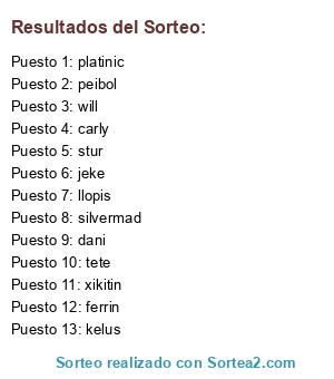 Lista de participantes: jeke, platinic, stur, kelus, silvermad, tete, llopis, will, peibol, dani, carly, xikitin, ferrin.
