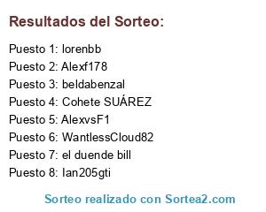 Lista de participantes: Alexf178, AlexvsF1, beldabenzal, lorenbb, Cohete SUÁREZ, WantlessCloud82, Ian205gti, el duende bill.