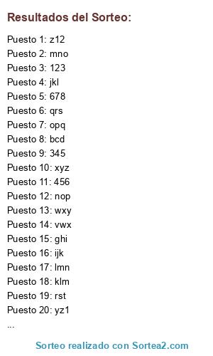 Lista de participantes: abc, bcd, cde, def, efg, fgh, ghi, hij, ijk, jkl, klm, lmn, mno, nop, opq, pqr, qrs, rst, stu, tuv, uvw, vwx, wxy, xyz, yz1, z12, 123, 234, 345, 456, 567, 678.