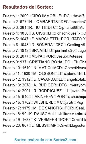Lista de participantes: 1 K. TRAPP POR victub Valencia, 6 S. RIETHER LD Havel7 Inter de Milan, 7 L. PODOLSKI MI iGosling v9 Barcelona, 17 A. BECK LD SeaL KapO x Napoles, 18 I. VORSAH DFC ankhilion Celtic, 19 S. SALIHOVIC MC Xsamu Manchester United, 20 ROBERTO FIRMINO MCO Havel7 Inter de Milan, 21 C. OBASI MD merayombasogo Boca Juniors, 23 G. SIGUROSSON MCO adizero1drose Nacional, 24 V. IBISEVIC DC Crivi Llagostera, 25 R. ADLER POR Rikel09 Fiorentina, 26 G. CASTRO MC NandoBel78 Leganes, 27 O. TOPRAK DFC cudeiro B. Leverkusen, 28 S. REINARTZ MCD Xsamu Manchester United, 29 M. KADLEC LI marcoss1 Everton, 33 A. SCHURRLE MI MrMohamRam Espanyol, 35 S. KIEBLING DC cudeiro B. Leverkusen, 39 E. DERDIYOK SD x chachiquesi x Cordoba, 41 M. NEUER POR carlosbode10 Ath. Bilbao, 42 RAFINHA LD Cipriano88 Ac Milan, 43 J. BOATENG DFC tabascos89 Albacete, 44 H. BADSTUBER DFC SSpecializeDD Manchester City, 45 P. LAHM MCD Crivi Llagostera, 47 B. SCHWEINSTEIGER MC Lorenbetico Betis, 48 A. ROBBEN MD marcoss1 Everton, 49 T. MULLER MD ulimoreno Juventus, 50 F. RIBERY MI SeaL KapO x Napoles, 51 M. GOMEZ DC Cipriano88 Ac Milan, 54 A. TYMOSHCHUK MCD carlosbode10 Ath. Bilbao, 57 D. ALABA LI tabascos89 Albacete, 58 I. OLIC DC adizero1drose Nacional, 59 R. WEIDENFELLER POR perikinho90 Lugo, 61 N. SUBOTIC DFC adrylito Malaga, 62 M. HUMMELS DFC marcoss1 Everton, 63 M. SCHMELZER LI alexfcbarcelona Recreativo, 64 S. BENDER MCD SrPistolas86 Levante, 66 M. GOTZE MCO Rikel09 Fiorentina, 67 S. KAGAWA MCO SrPistolas86 Levante, 68 K. GROBKREUTZ LD SrPistolas86 Levante, 71 S. KEHL MCD Saavexbox Las Palmas, 72 I. PERISIC MI cudeiro B. Leverkusen, 73 J. BLASZCZYKOWSKI MD adrylito Malaga, 74 R. LEWANDOWSKI DC adrylito Malaga, 78 DANTE DFC MrMohamRam Espanyol, 79 M. REUS MI NandoBel78 Leganes, 82 J. DROBNY POR angelitotabasco Bayern Munich, 83 H. WESTERMANN DFC x chachiquesi x Cordoba, 84 D. AOGO LI iGosling v9 Barcelona, 87 M. JANSEN LI TheForceMaker Alcorcon, 99 K. RAUSCH LI JulitrosMartin Sp. Gijon, 104 D. YA KONAN DC cudeiro B. Leverkusen, 108 B. HOWEDES DFC ulimoreno Juventus, 109 C. FUCHS LI lvaan Atco. Madrid, 111 L. HOLTBY MCO cruz88 B. Dortmund, 112 J. FARFAN MD misterserpico Sounders, 114 K. HUNTELAAR DC carlosbode10 Ath. Bilbao, 116 JURADO MI Adriantr127 Arsenal, 120 J. JONES MCD cudeiro B. Leverkusen, 121 O. BAUMANN POR ferminnn Ajax, 123 P. CISSE DC javitr Psg, 125 S. TASCI DFC Red Dutti Granada, 138 D. BENAGLIO POR iGosling v9 Barcelona, 141 M. SCHAFER LI Xsamu Manchester United, 145 M. MANDZUKIC DC jesus022 Villarreal, 154 T. WIESE POR cudeiro B. Leverkusen, 155 SOKRATIS DFC ferminnn Ajax, 156 NALDO DFC Crivi Llagostera, 158 A. HUNT MCO JulitrosMartin Sp. Gijon, 159 M. MARIN MCO cudeiro B. Leverkusen, 160 M. ARNAUTOVIC MI alemalaga94 Benfica, 161 C. PIZARRO DC JulitrosMartin Sp. Gijon, 170 X. SHAQIRI MD adrylito Malaga, 172 V. STOCKER MI JoniMou Rayo Vallecano, 178 F. MUSLERA POR ulimoreno Juventus, 181 FELIPE MELO MCD MrMohamRam Espanyol, 183 T. HUBOCAN DFC Red Dutti Granada, 184 E. EBOUE LD cruz88 B. Dortmund, 186 RIERA LI adrylito Malaga, 193 V. TOROSIDIS LD iRandy v8 Liverpool, 195 K. PAPADOPOULOS DFC jesus022 Villarreal, 210 VIEIRINHA MD Xsamu Manchester United, 212 G. VAN DER WIEL LD escrich7 Chelsea, 214 J. VERTONGHEN DFC merayombasogo Boca Juniors, 219 M. EL HAMDAOUI DC lvaan Atco. Madrid, 223 D. TADIC MCO JulitrosMartin Sp. Gijon, 225 DOUGLAS DFC Jesub Vitesse, 227 L. DE JONG DC adizero1drose Nacional, 231 A. ISAKSSON POR alemalaga94 Benfica, 233 G. WIJNALDUM MCO TheForceMaker Alcorcon, 235 O. TOIVONEN DC SeaL KapO x Napoles, 236 J. LENS ED ulimoreno Juventus, 241 O. ASSAIDI MI Red Dutti Granada, 244 P. CECH POR Saavexbox Las Palmas, 246 B. IVANOVIC LD cudeiro B. Leverkusen, 247 J. TERRY DFC SeaL KapO x Napoles, 248 A. COLE LI Jesub Vitesse, 250 RAUL MEIRELES MC JoniMou Rayo Vallecano, 251 F. LAMPARD MC JulitrosMartin Sp. Gijon, 252 D. STURRIDGE DC SSpecializeDD Manchester City, 253 D. DROGBA DC cruz88 B. Dortmund, 254 MATA MCO merayombasogo Boca Juniors, 256 DAVID LUIZ DFC sergiotabascos89 Real Madrid, 258 FERNANDO TORRES DC angelitotabasco Bayern Munich, 260 J. MIKEL MCD Crivi Llagostera, 261 S. KALOU DC SeaL KapO x Napoles, 262 ALEX DFC jesus022 Villarreal, 264 R. LUKAKU DC victub Valencia, 265 M. ESSIEN MC adizero1drose Nacional, 266 T. HOWARD POR Xsamu Manchester United, 268 P. JAGIELKA DFC escrich7 Chelsea, 269 S. DISTIN DFC TATO XD Depor, 270 L. BAINES LI MrMohamRam Espanyol, 273 J. RODWELL**** MC Havel7 Inter de Milan, 278 D. BILYALETDINOV MI ankhilion Celtic, 279 P. POGBA MC Jesub Vitesse, 284 B. HANGELAND DFC Lorenbetico Betis, 289 C. DEMPSEY MP x chachiquesi x Cordoba, 293 B. RUIZ ED Red Dutti Granada, 294 M. DEMBELE MC Cipriano88 Ac Milan, 295 PEPE REINA POR alexfcbarcelona Recreativo, 296 M. KELLY LD merayombasogo Boca Juniors, 298 D. AGGER DFC Rikel09 Fiorentina, 300 J. HENDERSON MC TheForceMaker Alcorcon, 301 S. GERRARD MCD JoniMou Rayo Vallecano, 302 LUCAS LEIVA MCD TATO XD Depor, 305 L. SUAREZ DC Rikel09 Fiorentina, 307 M. SKRTEL DFC iRandy v8 Liverpool, 310 A. CARROLL DC lvaan Atco. Madrid, 312 G. JOHNSON LD merayombasogo Boca Juniors, 314 J. HART POR SrPistolas86 Levante, 315 M. RICHARDS LD sergiotabascos89 Real Madrid, 316 V. KOMPANY DFC merayombasogo Boca Juniors, 317 J. LESCOTT DFC victub Valencia, 318 G. CLICHY LI adrylito Malaga, 319 Y. TOURE MC ankhilion Celtic, 321 DAVID SILVA MCO victub Valencia, 322 S. NASRI MI Saavexbox Las Palmas, 323 S. AGÜERO DC perikinho90 Lugo, 324 C. TEVEZ DC x chachiquesi x Cordoba, 325 K. TOURE DFC tabascos89 Albacete, 326 N. DE JONG MCD Rikel09 Fiorentina, 327 J. MILNER MD Red Dutti Granada, 328 A. JOHNSON MD alexfcbarcelona Recreativo, 329 E. DZEKO DC MrMohamRam Espanyol, 330 M. BALOTELLI DC Cipriano88 Ac Milan, 331 A. KOLAROV LI Crivi Llagostera, 332 P. ZABALETA LD escrich7 Chelsea, 333 N. ONUOHA DFC adizero1drose Nacional, 337 DE GEA POR MrMohamRam Espanyol, 338 C. SMALLING DFC x chachiquesi x Cordoba, 339 R. FERDINAND DFC JulitrosMartin Sp. Gijon, 340